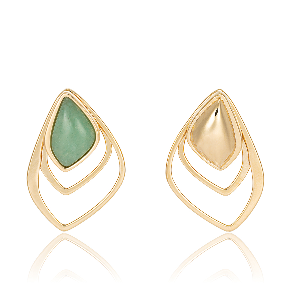 Acompanha 3 peças, 2 variações de brincos pequenos (um com ágata verde e outro sem pedra), juntamente com peça geometrica de ouro para ser usada em conjunto com um desses brincos.