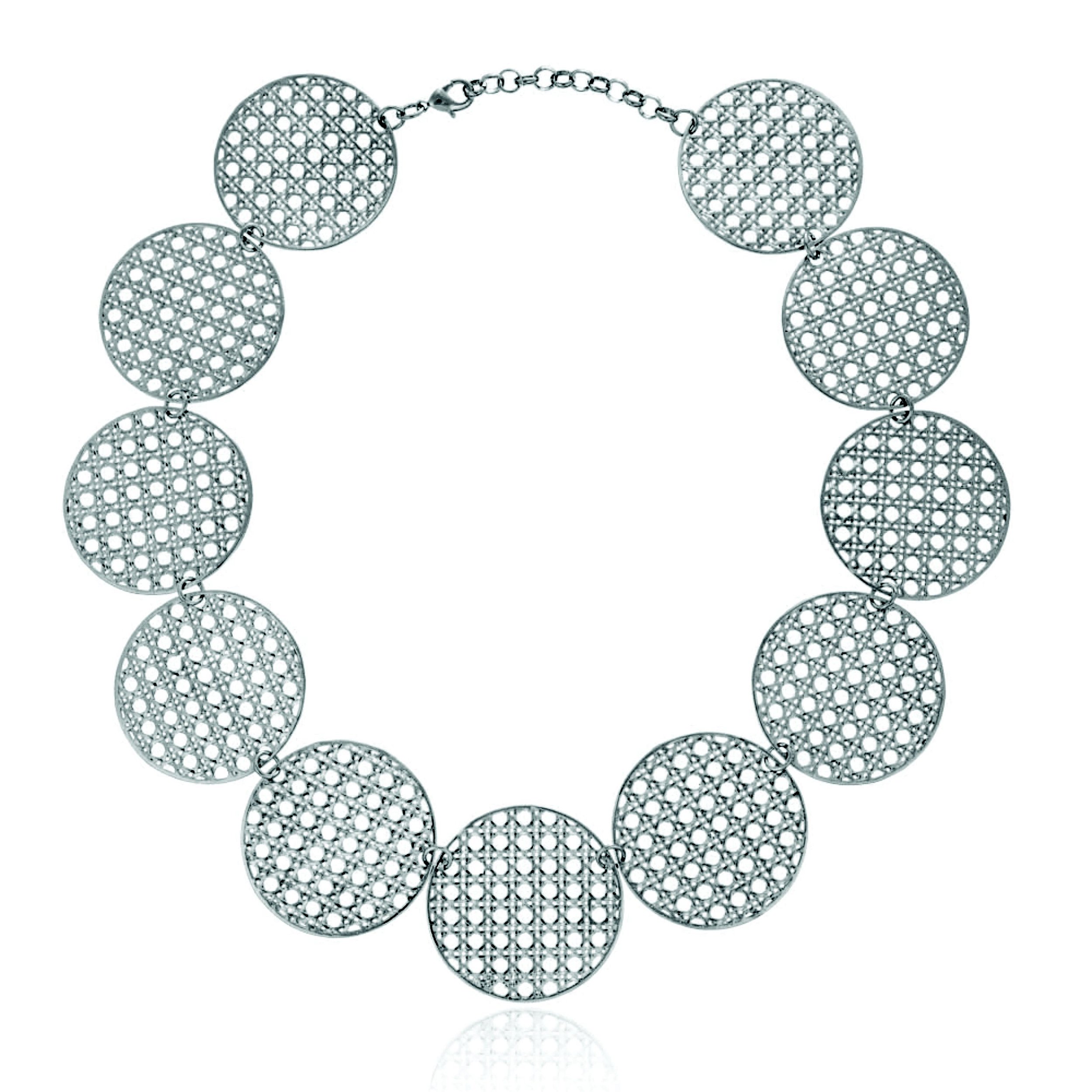 COLAR COM BANHO DE RÓDIO NEGRO, INSPIRAÇÃO NA TRAMA DA PALHINA INDIANA E NO MOBILIÁRIO DE SÉRGIO RODRIGUES.